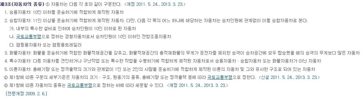 국토교통부 법 제3조에 따르면 캠핑용 자동차와 캠핑용 트레일러는 승합차로 분류되고 있다. 승합차는 고속도로 1차선 진입이 가능하다. 1차로 주행이 위법은 아니지만 위험하기 때문에 3,4차로로의 주행이 적합하다고 필자는 생각한다. 국내 레저인구가 증가하면서 픽업트럭 시장이 활발해졌다. (때문에 외국의 픽업트럭 선두 브랜드에서도 국내 출시 및 출시 준비를 하고 있다) 레저용으로 유용하기 때문에 픽업트럭과 트레일러 조합으로 레저생활을 즐기는 인구가 많다. 픽업트럭은 화물차로 분류되기 때문에 캠핑용 트레일러를 견인을 하더라도 1~2차로 주행은 위법이다. 최근 국토교통부에서 캠핑용 자동차, 캠핑용 트레일러 급증으로 관련 법령을 개정을 하고 있는 것으로 보인다. 다시 찾아본 국토교통부 자동차관리법 법령 제3조 2항 다에 일부 내용이 삭제되었다.