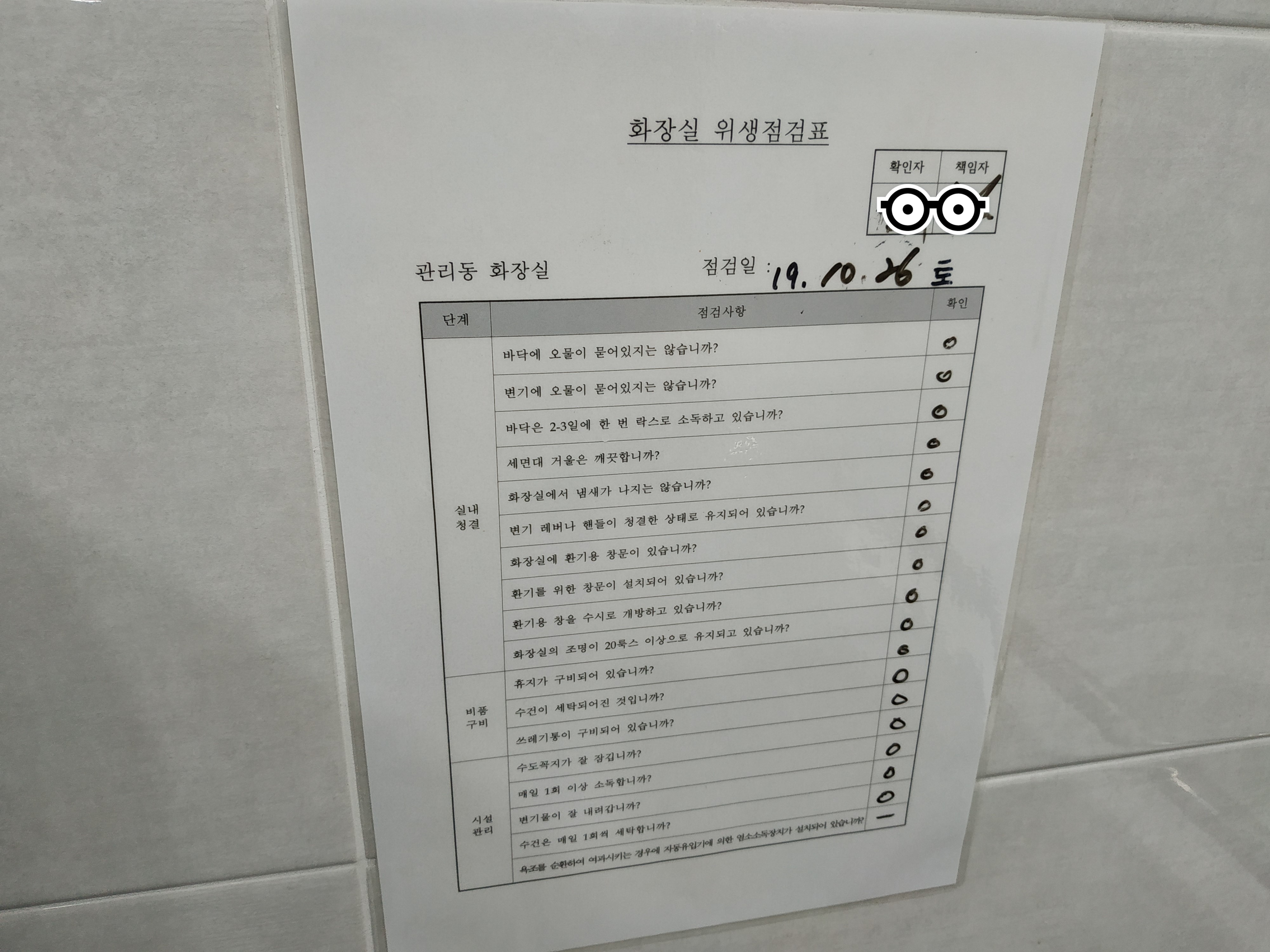 화장실은 매일 매일 위생점검이 되고 있다. (개인정보 보호를 위해 담당자 서명은 스티커 처리)