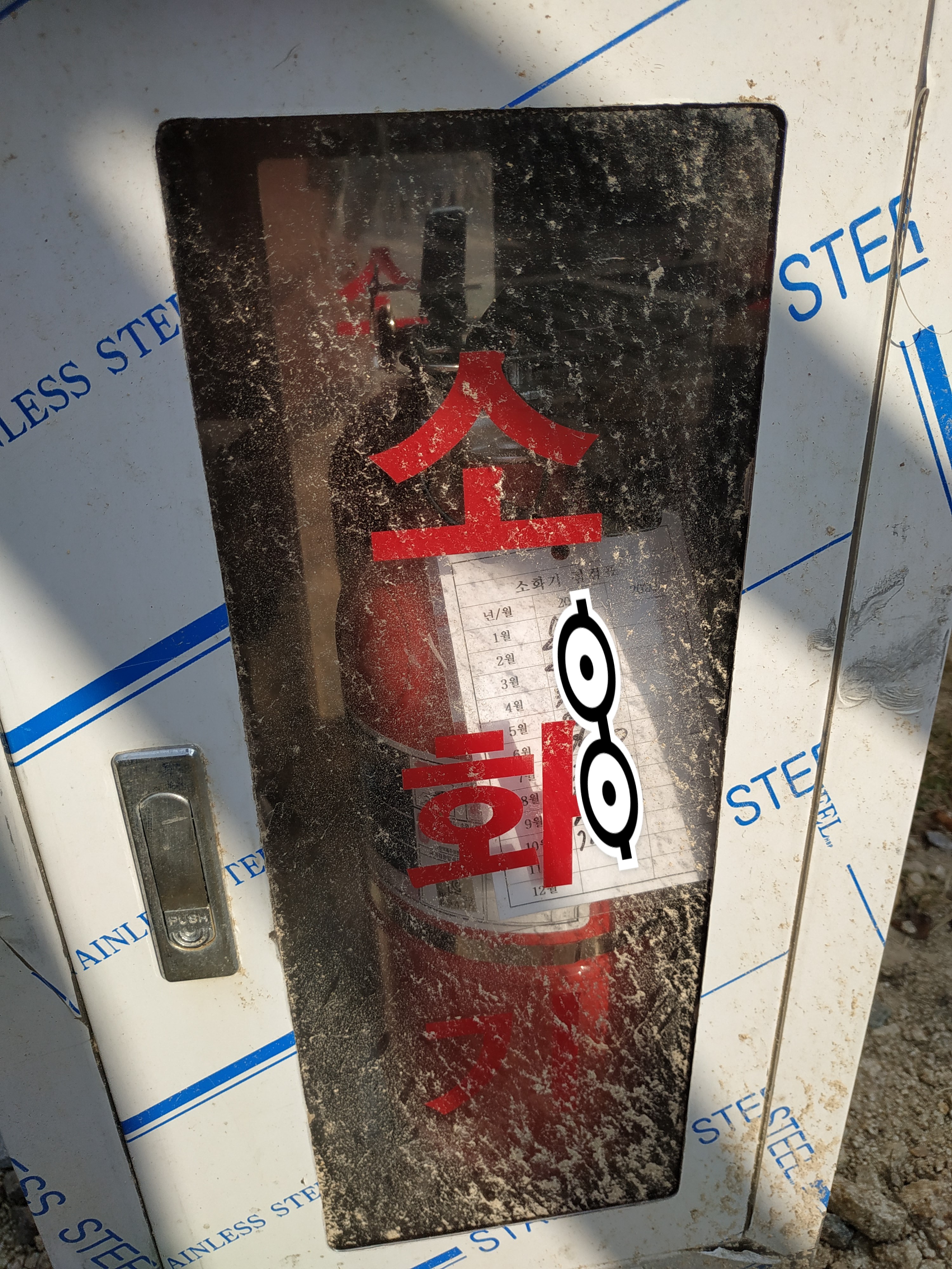 비치된 모든 소화기는 월별 점검되고 있는 것으로 보아 관리 상태가 매우 우수하다. (개인정보 보호를 위해 담당자 서명은 스티커 처리)