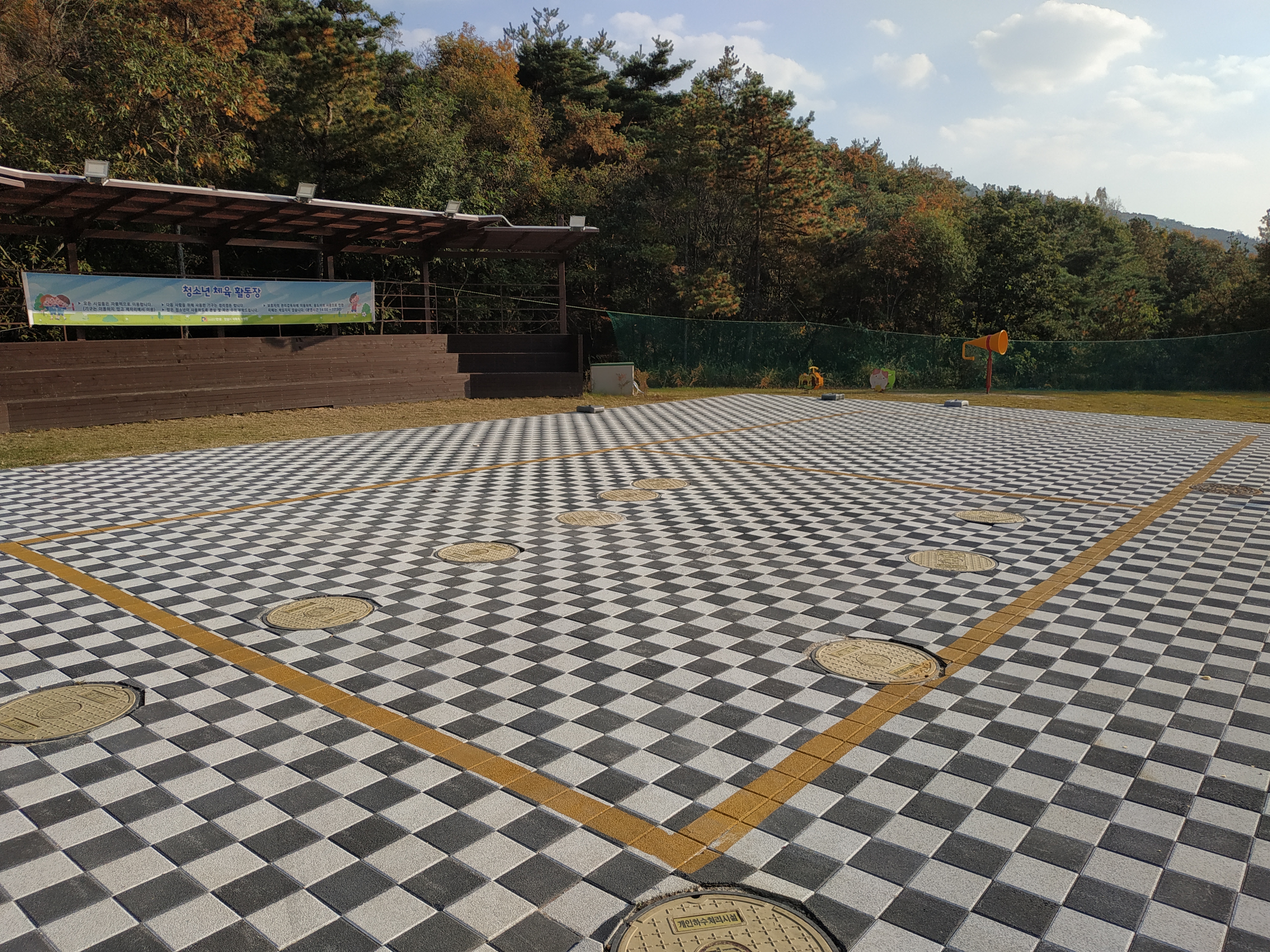 관리동 앞에는 체육 활동장(운동장)이 있다. 바닥의 노란색 마킹을 이용하여 족구, 피구, 배드민턴 등을 즐기기에 충분하다.