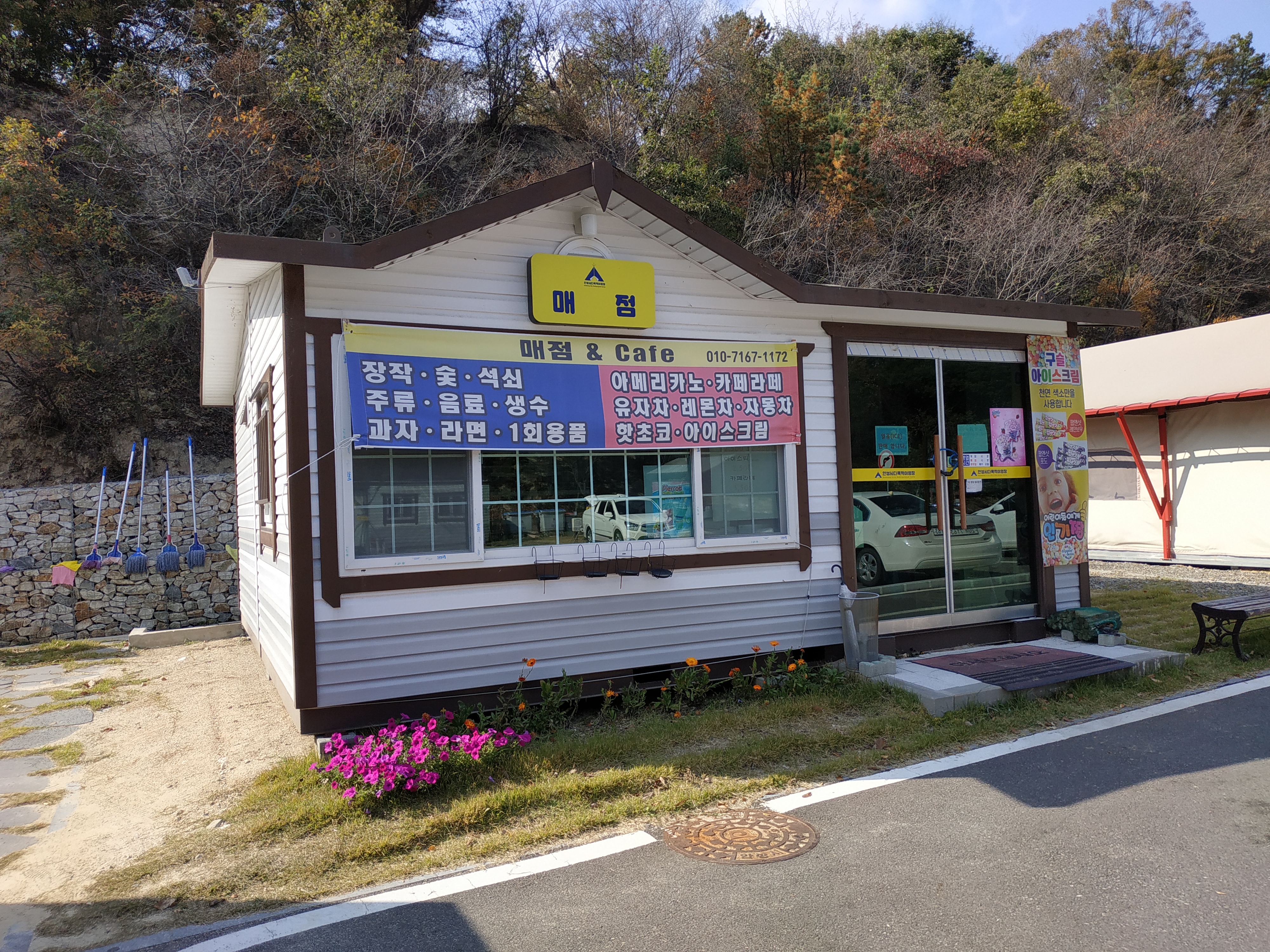 샤워실 앞에는 매점이 보인다. 일요일 늦은 오후에 매점은 닫혀 있었다. 야영장 이용객이 적을 시 탄력적으로 운영하는 것으로 보인다. 외부 마트 또는 편의점까지 가려면 차량으로 이동해야하기 때문에 필요한 준비물은 사전에 준비하는 것이 바람직하다.
